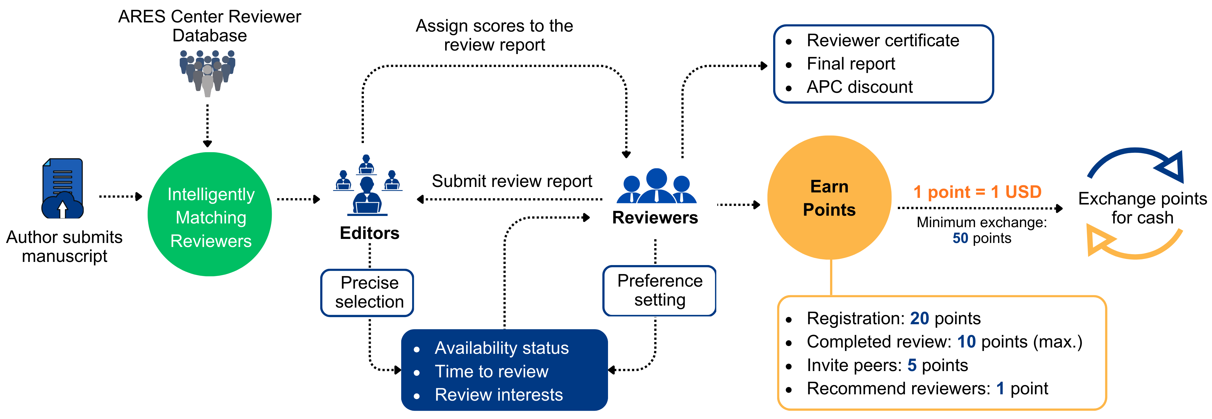 Reviewers in ARES are encouraged to invite peers to join the system, and they will receive five points if the invited peer registers successfully and is verified as a reviewer.